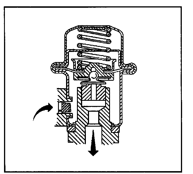The fuel pressure regulator assembly is a diaphragm-operated relief valve with fuel pump pressure on one side, and a regulator spring pressure and intake manifold vacuum on the other side. The regulator's function is to maintain a constant pressure differential across the injectors at all times. The pressure regulator compensates for engine load by increasing the fuel pressure as the engine vacuum drops. The fuel pressure regulator is serviced as a complete assembly. With the ignition ON and engine OFF (zero vacuum), fuel pressure should be 284 - 325 kPa (41 - 47 psi). Whenever the pressure is too low, poor performance and a DTC P0171 could result. Whenever the pressure is too high, excessive odor and a DTC P0172 could result.
