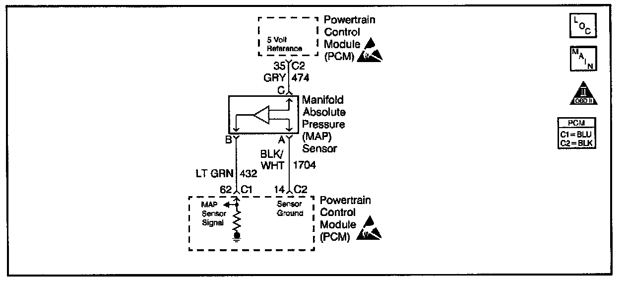 The Manifold Absolute Pressure (MAP) sensor measures the changes in the intake manifold pressure which result from the engine load (intake manifold vacuum) and the RPM changes then converts these into a voltage output. The Powertrain Control Module (PCM) supplies a 5 volt reference voltage to the MAP sensor. As the manifold pressure changes, the output voltage of the sensor also changes. By monitoring the sensor output voltage, the PCM knows the manifold pressure. A lower pressure (low voltage) output voltage will be about 1.0 to 1.5 volts at idle. While high pressure (high voltage) output voltage will be about 4.5 to 4.8 volts at Wide Open Throttle (WOT). The MAP sensor is also used, under certain conditions, to measure barometric pressure, allowing the PCM to make adjustment for different altitudes. The PCM uses the MAP sensor in order to control the fuel delivery and the ignition timing.