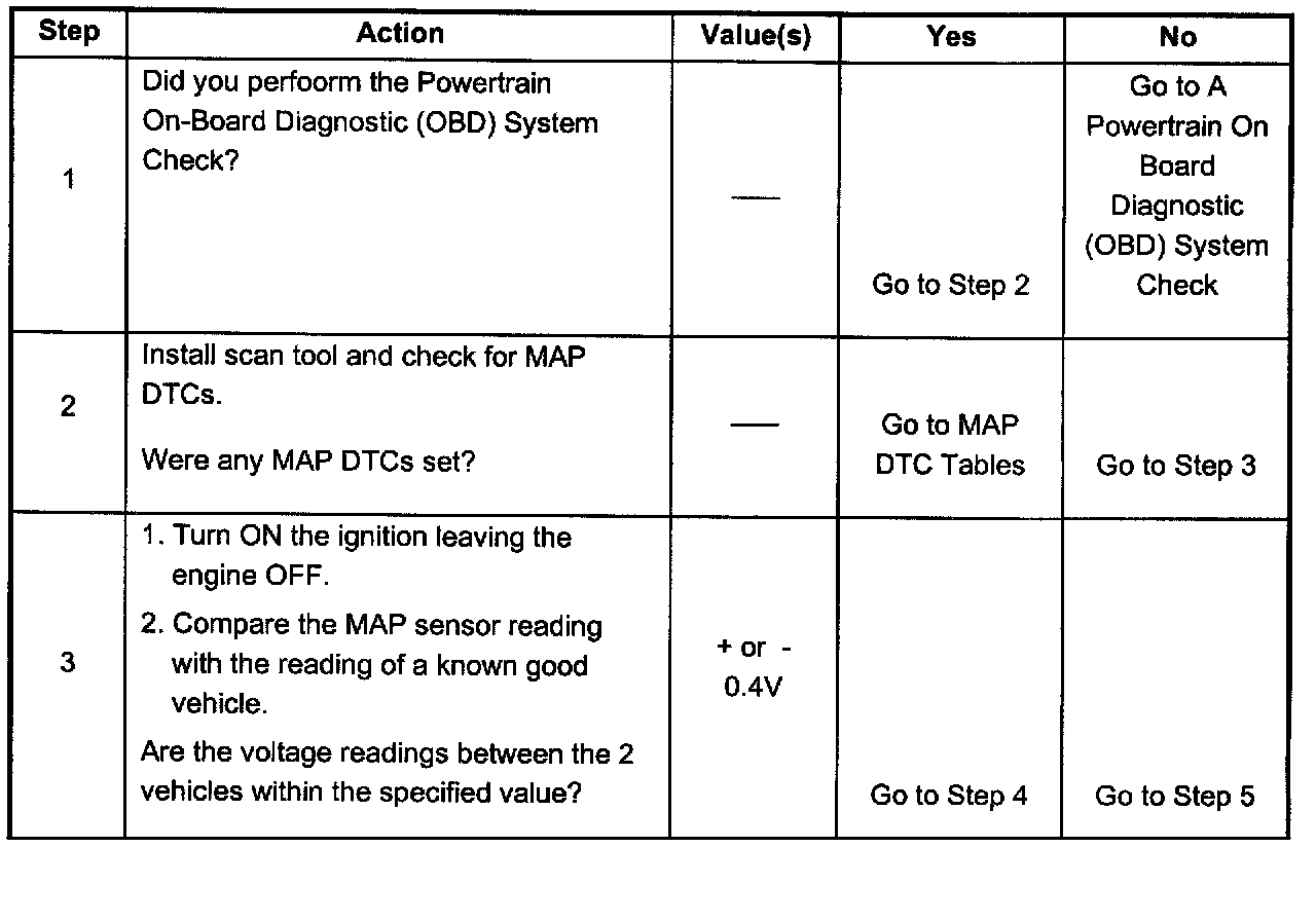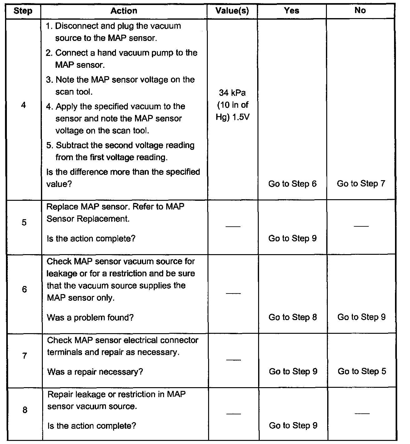 4. Applying 34 kPa (10 in of Hg) vacuum to the MAP sensor should cause the voltage to be 1.5 to 2.1 volts less than the voltage at Step 3. Upon applying vacuum to the sensor, the change in voltage should be instantaneous. A slow voltage change indicates a malfunctioning sensor.