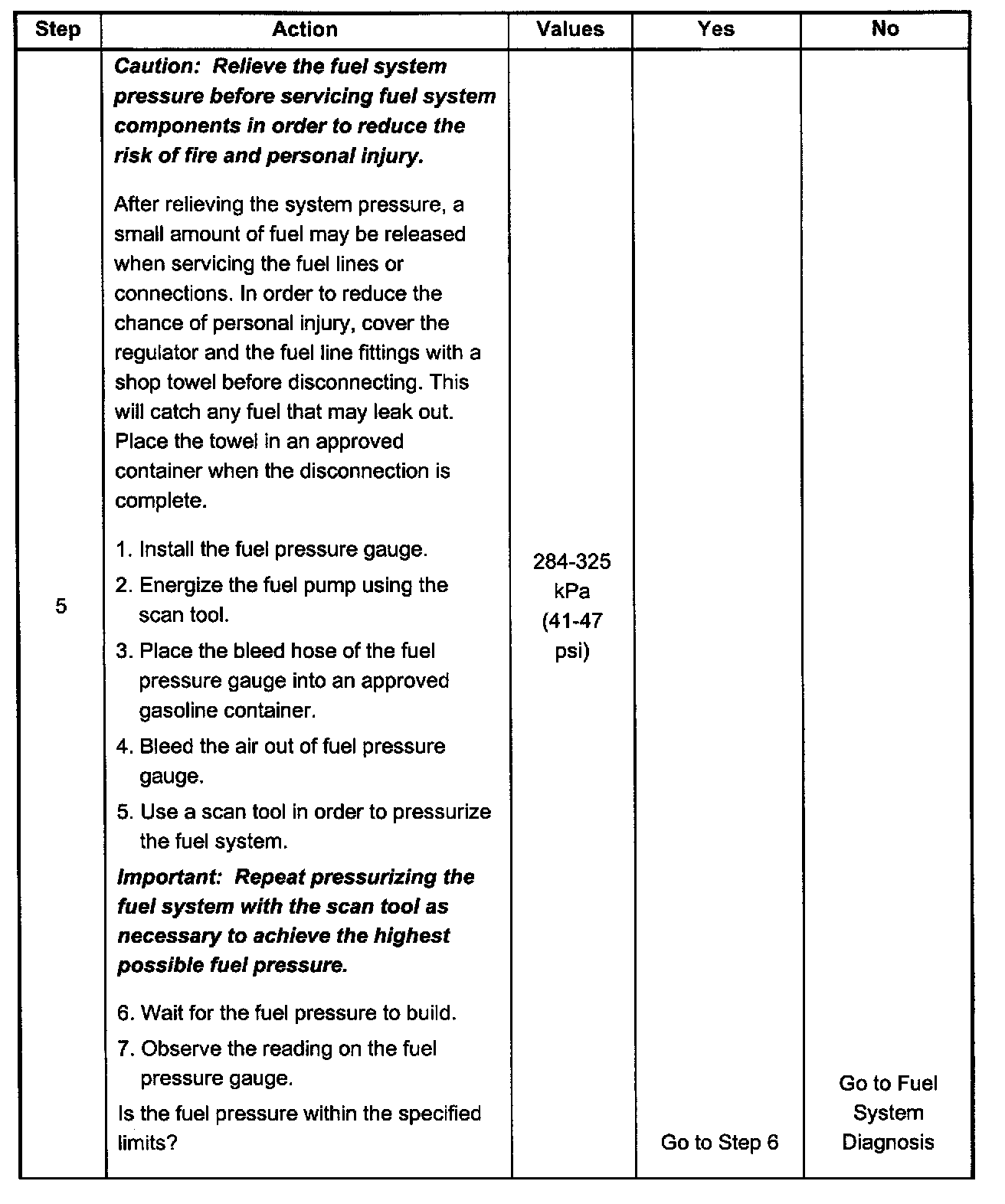5. The fuel pressure should be within the specified range. If the fuel pressure is not within the specified range, go to Fuel System Diagnosis.