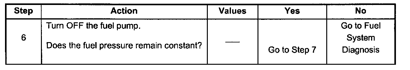 6. The fuel pressure should reach a steady value. If the fuel pressure does not reach a steady value, refer to Fuel System Diagnosis.