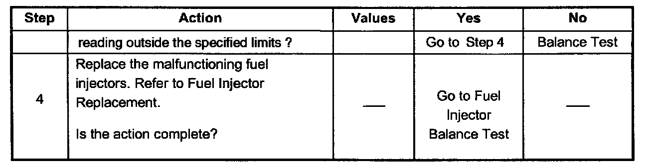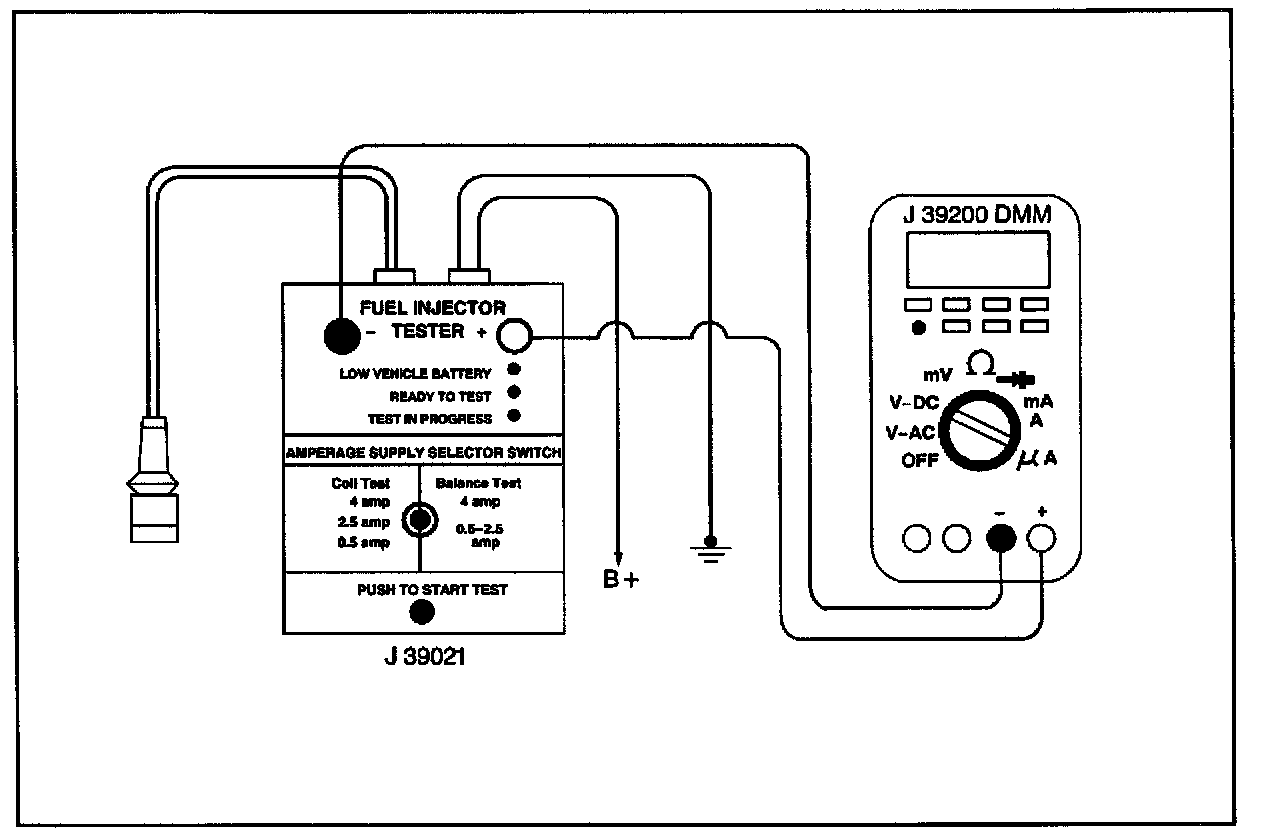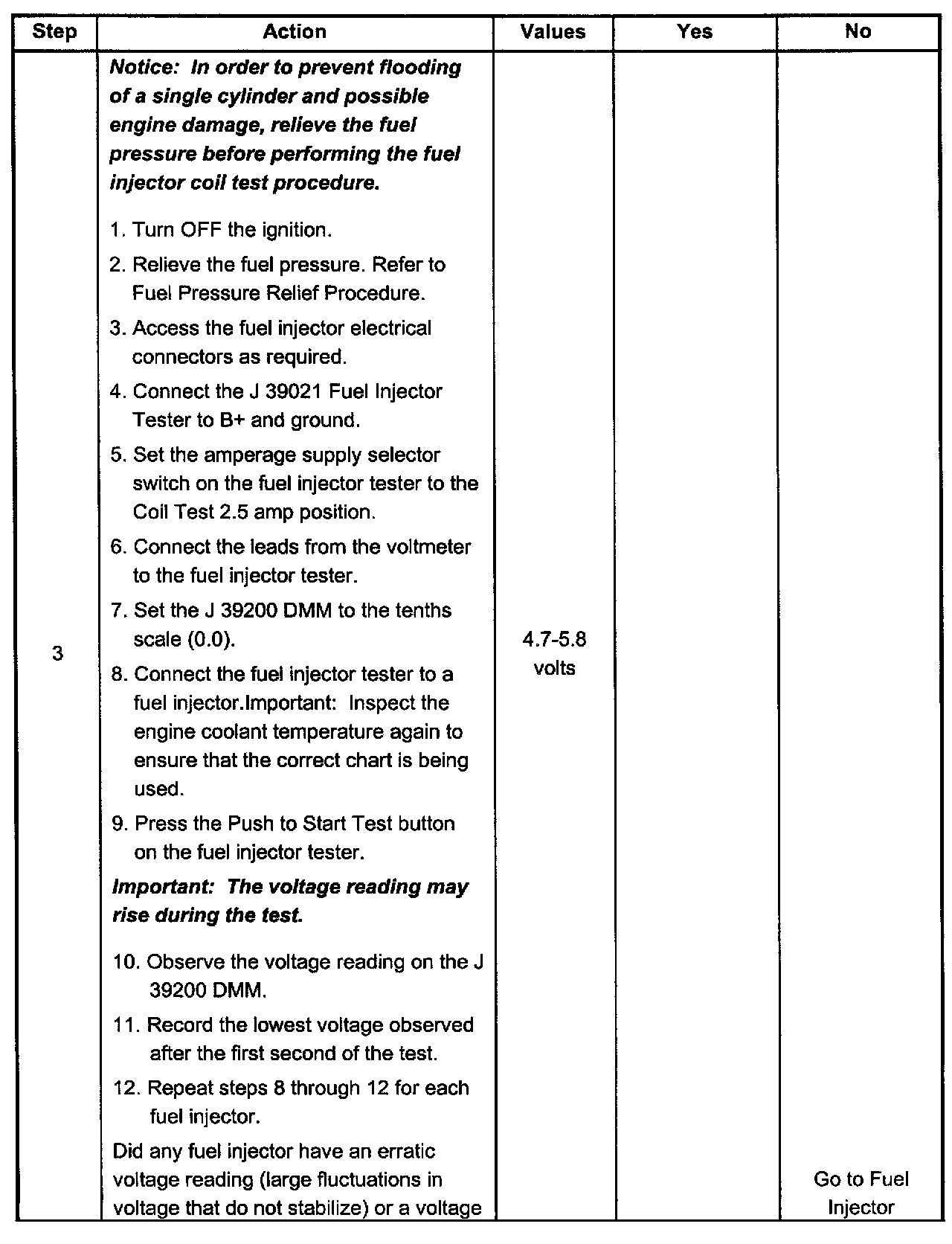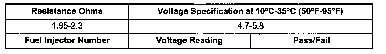 3. The first second of the voltage displayed by the DMM may be inaccurate due to the initial current surge, therefore, record the lowest voltage displayed by the DMM after the first second of the test. The voltage displayed by the DMM should be within the specified range (refer to the Example). The voltage displayed by the DMM may increase throughout the test as the fuel injector windings warm and the resistance of the fuel injector windings changes. An erratic voltage reading (large fluctuations in voltage that do not stabilize) indicates an intermittent connection within the fuel injector.