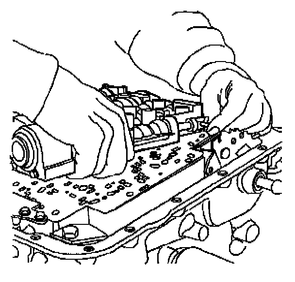 2. Install the valve body over the J 25025-5 Guide Pins, and connect the manual valve link to the manual valve.