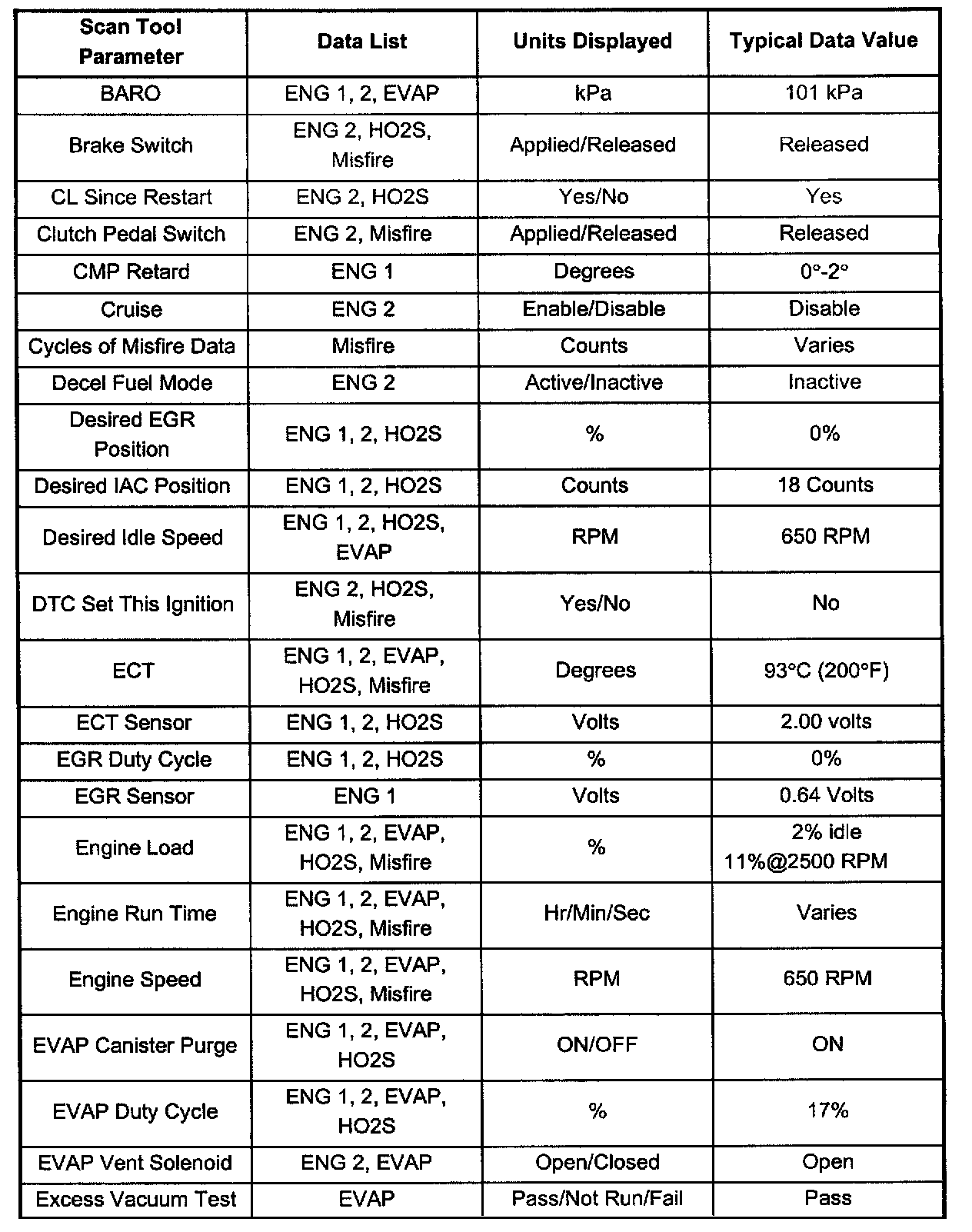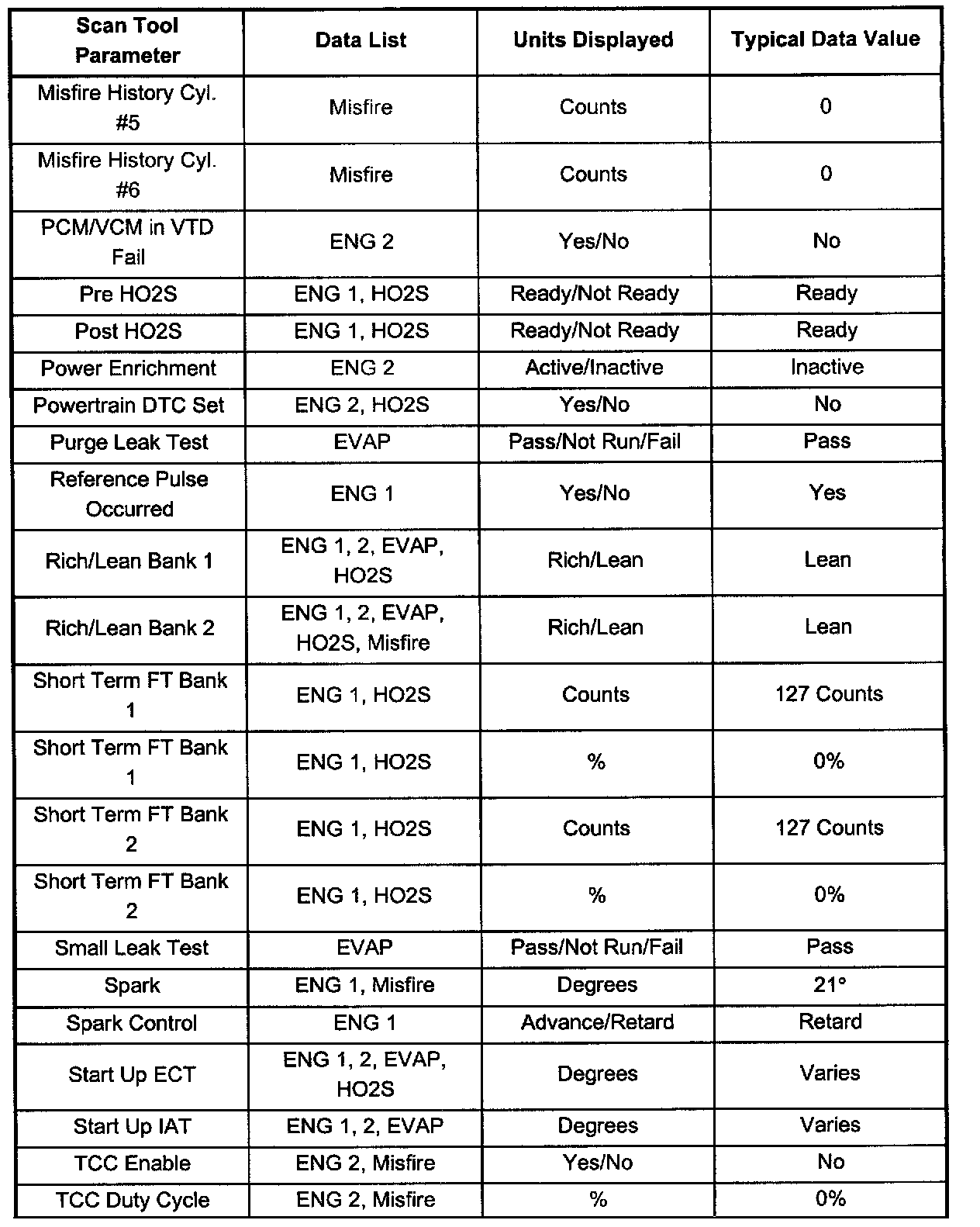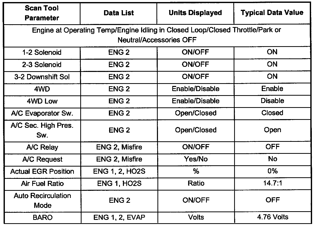 Use the scan tool data listed in this table for comparison after performing the Powertrain On-Board Diagnostic System Check and finding the on-board diagnostics function properly with no diagnostic codes displayed. Not all parameters will apply to each vehicle. Use only the parameters which apply to your particular vehicle.