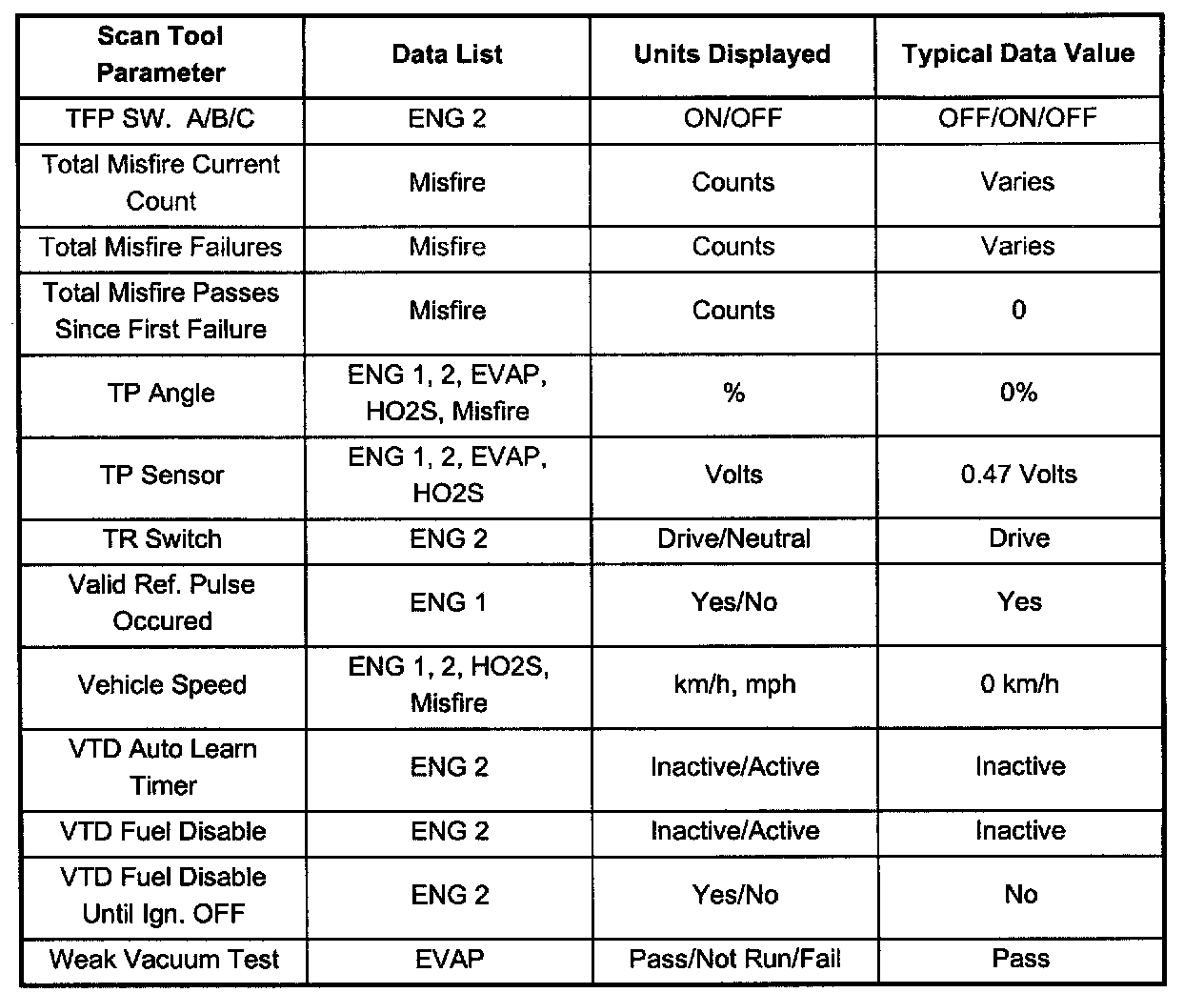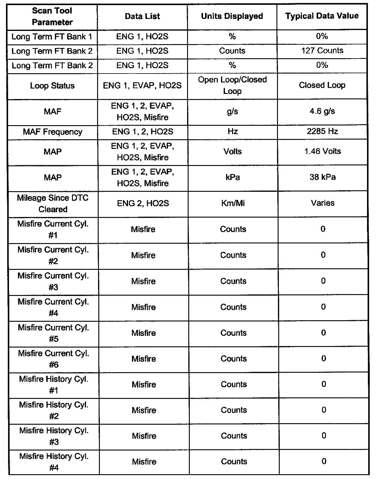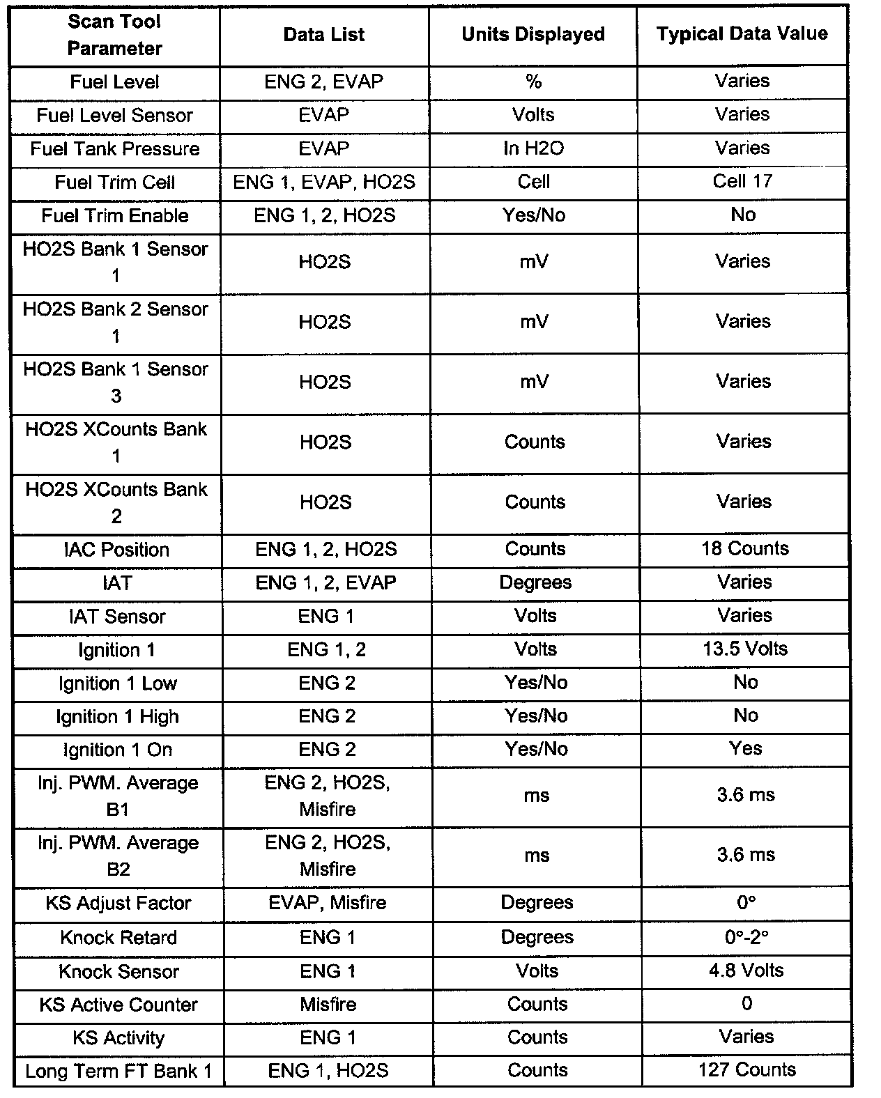 Use the scan tool data listed in this table for comparison after performing the Powertrain On-Board Diagnostic System Check and finding the on-board diagnostics function properly with no diagnostic codes displayed. Not all parameters will apply to each vehicle. Use only the parameters which apply to your particular vehicle.
