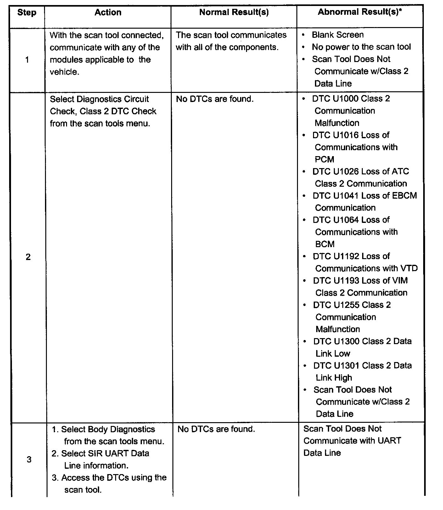 2. This step inspects the Class 2 communications system connections and any DTCs that may be set.