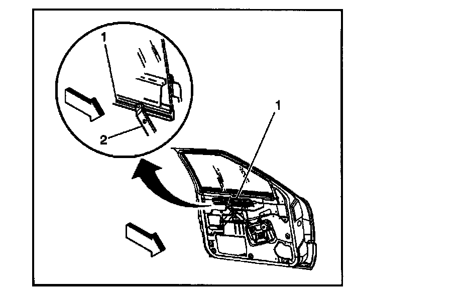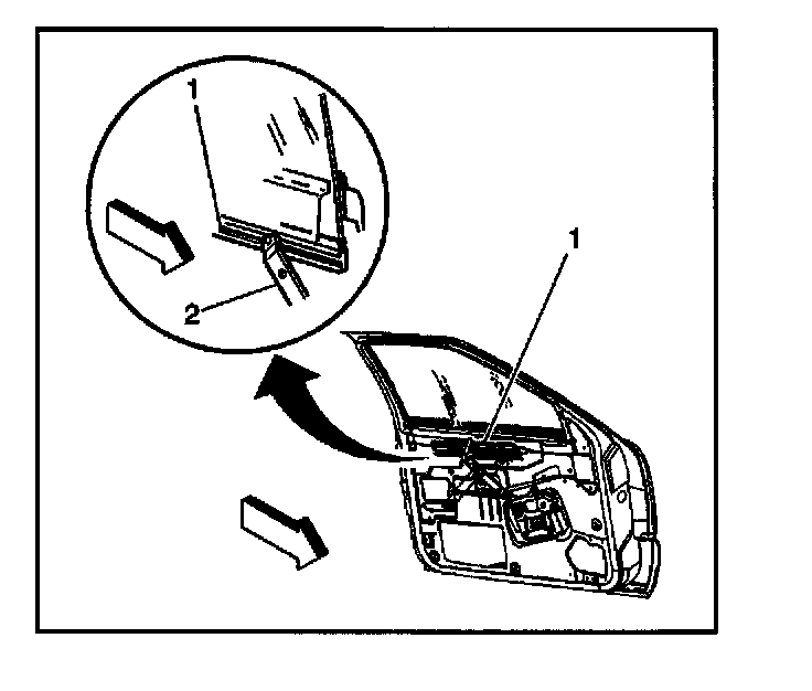2. Slide the sash channel (1) downward into the front regulator roller (2).