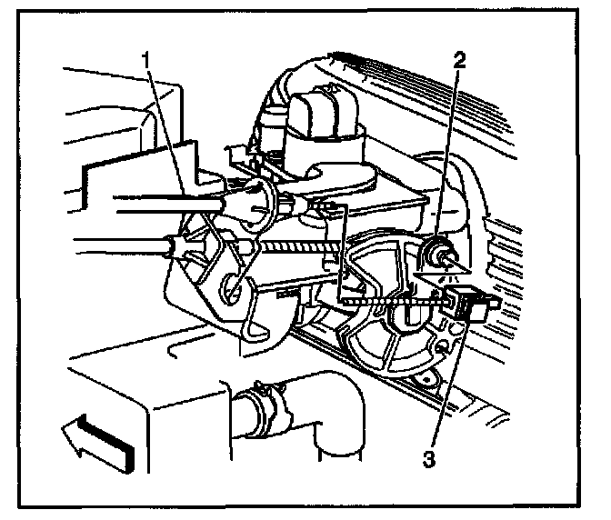3. In order to release the tension on the cruise control adjuster, rotate the cam lever. Disconnect the cruise control cable adjuster (3) from the nail head on the throttle cam lever.