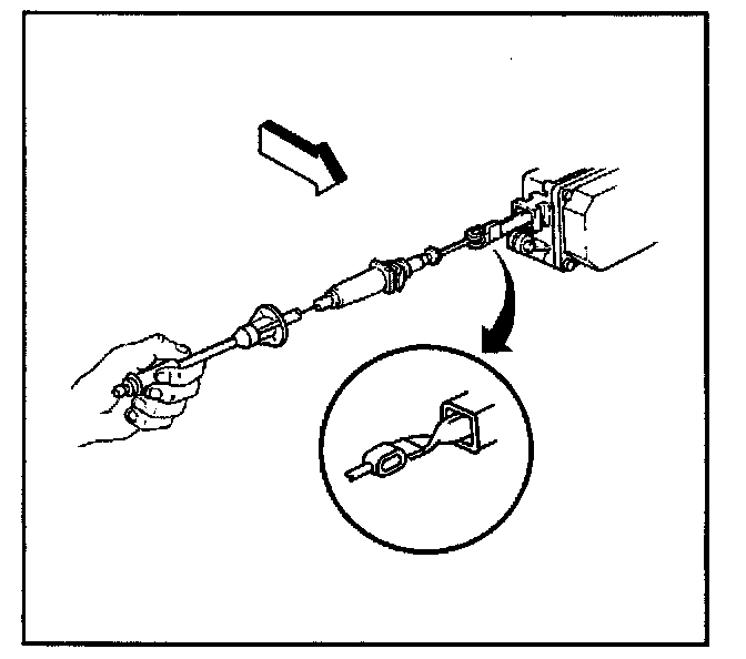 9. Pull the cable conduit toward the right side of the vehicle. Thread the cable through the slot in the round hole of the cable bracket.