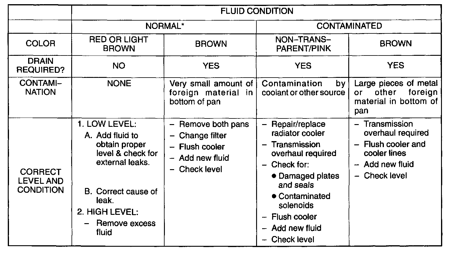 CHECKING TRANSMISSION FLUID LEVEL AND CONDITIONChecking fluid level and condition (color and odor) at regular intervals will provide early diagnosis information about the transmission. This information may be used to correct a condition that, if not detected early, could result in major transmission repairs.