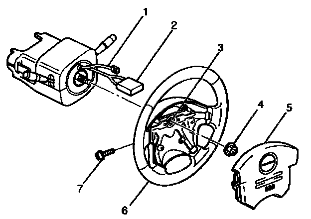 2. Remove the air bag assembly (5) from steering wheel (6) by removing two bolts (7). Lift air bag assembly out of steering wheel.