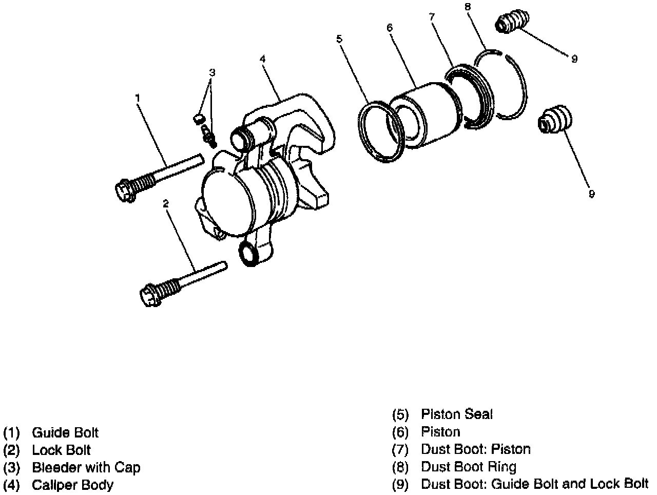 NOTE: The piston dust seal and dust boot are to be replaced each time the caliper is overhauled. Discard these used rubber parts and replace with new ones.