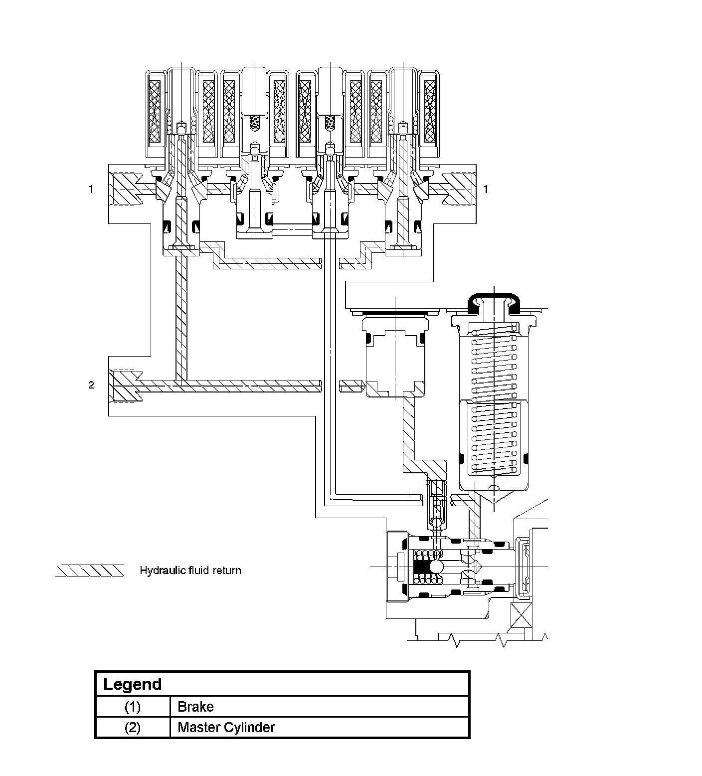 At the end of the anti-lock stop, when the brake pedal is released, the pump will remain running for a short time to help drain any fluid from the accumulators. As this fluid returns into the system, the spring forces the piston back to its original position.