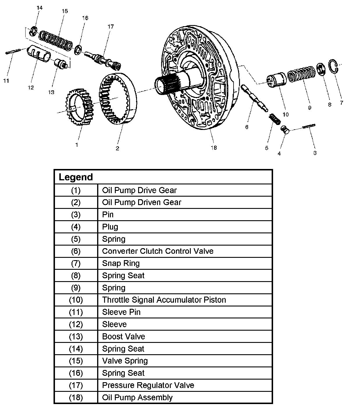 5. Install throttle signal accumulator piston (10), spring (9), and spring seat (8), with the flat side away from the spring, and snap ring (7) to oil pump assembly (18).
