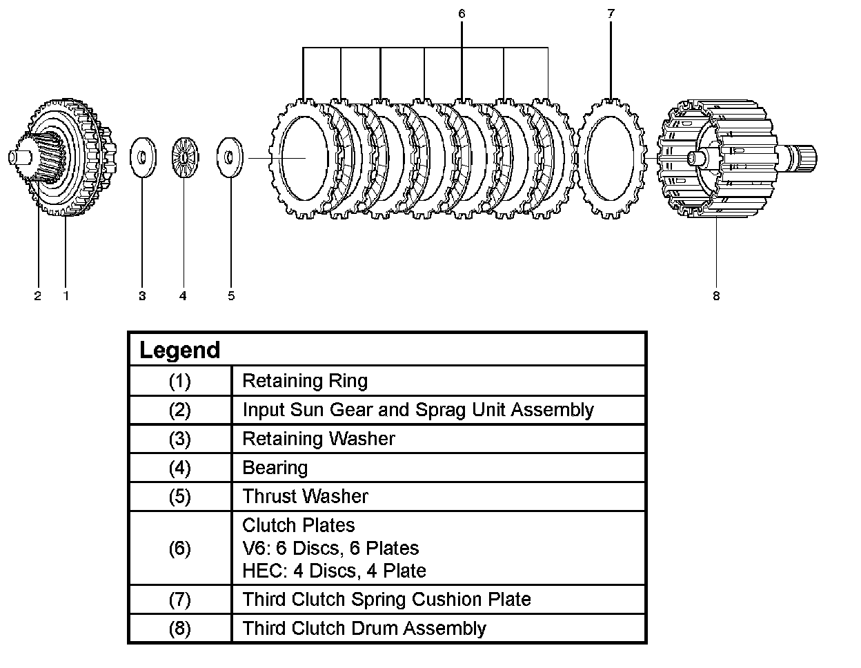 3. Install third clutch plates (6) into third clutch drum assembly (8). Start with the steel clutch plate and alternate with lined plates.