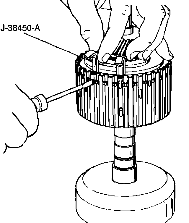 2. Locate the ends of the retaining ring. Depress one end of the ring using a small screwdriver instead of the depressor handle provided with the tool J-38450-A. Slide one blade down between the third clutch drum and the retaining ring.