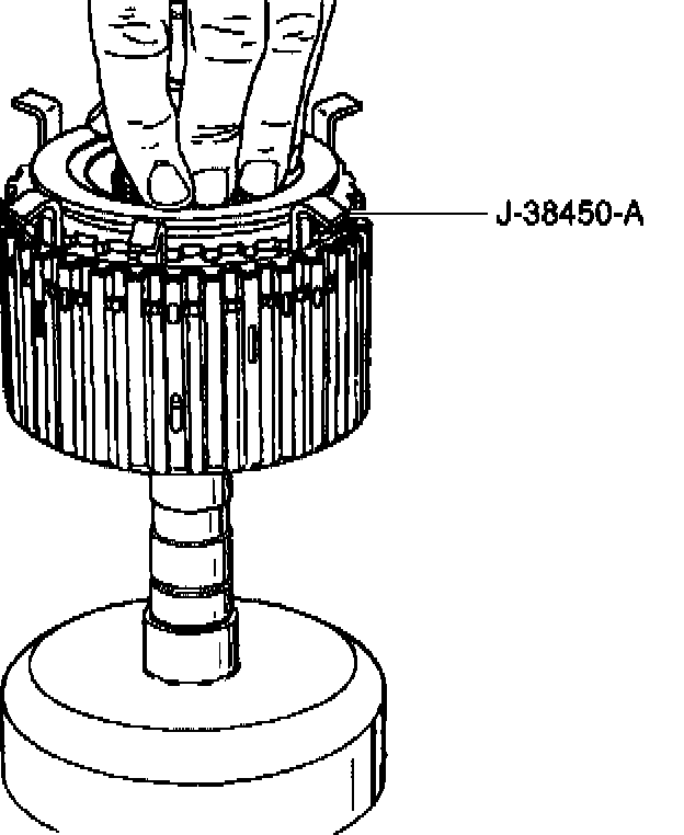 6. Place J-38450-A blades between the retaining ring and the third clutch drum approximately (five) notches apart, and one blade at each end of the retaining ring (1). Push down on sprag assembly until the assembly is seated into the third clutch drum assembly (8).