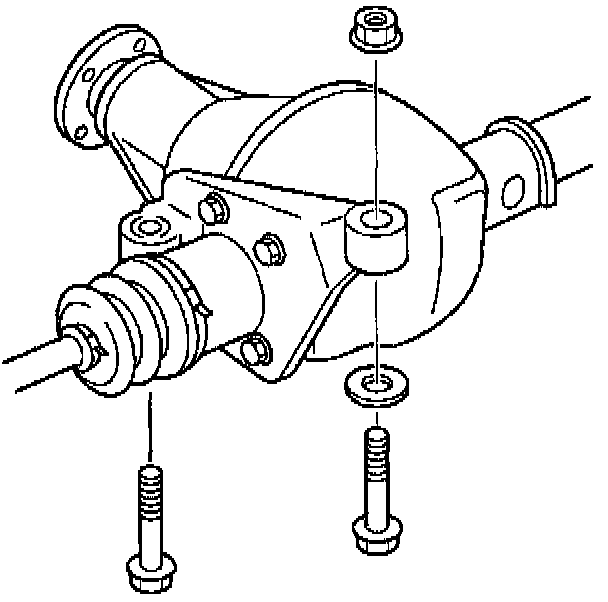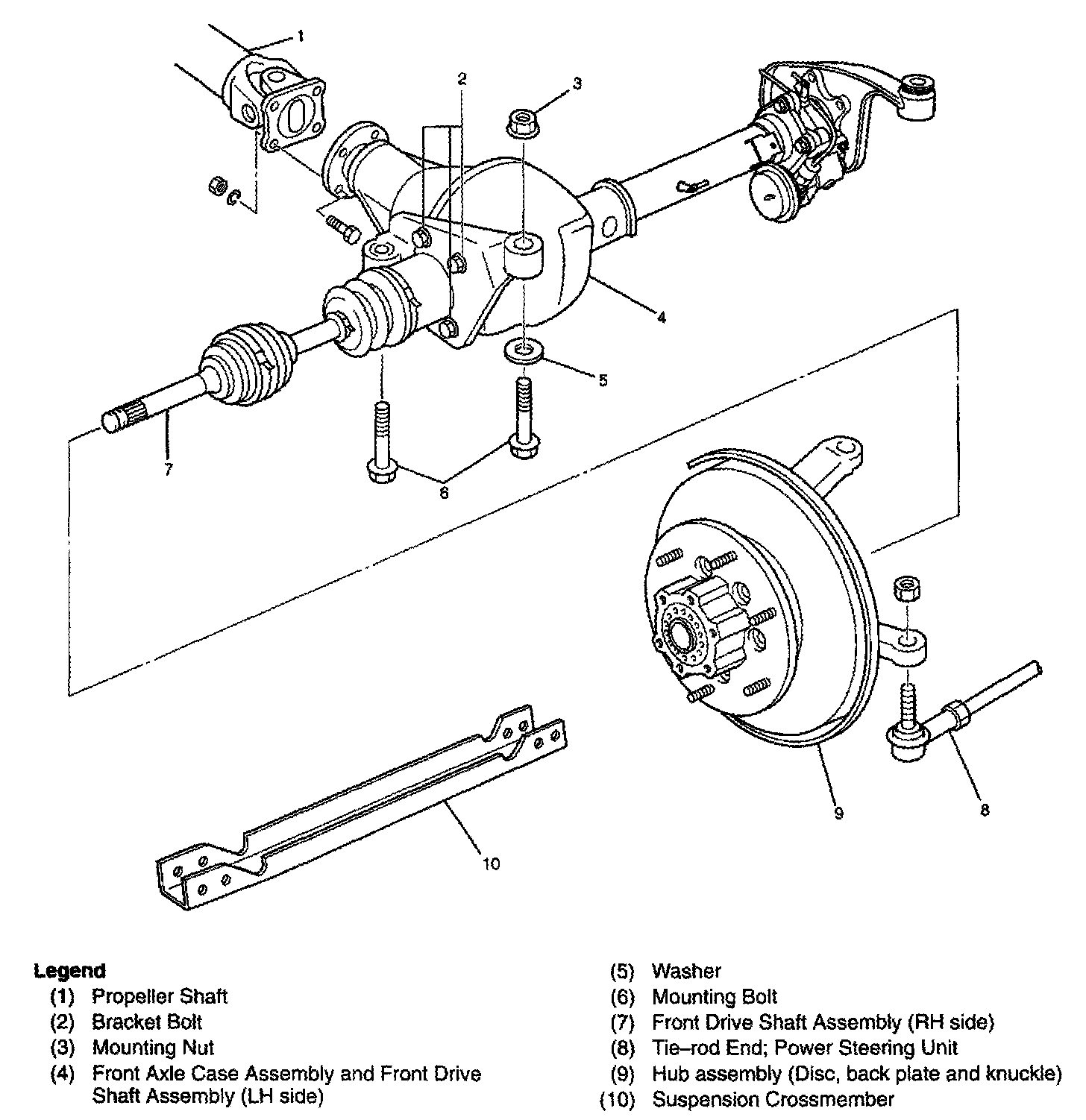 18. Remove the front axle mounting bolts and nuts, lower the jack slowly. Remove the left side drive shaft end from the knuckle, then lower the axle assembly from the vehicle.
