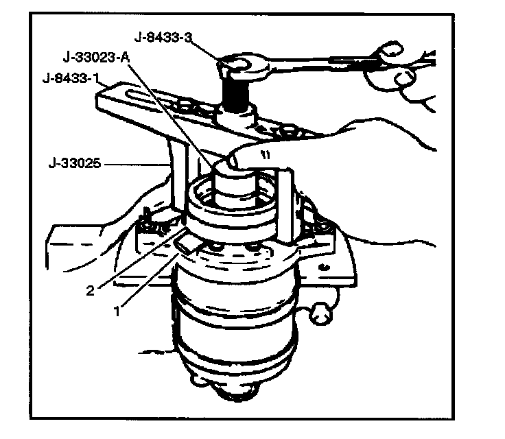 3. Tighten J-8433-3 forcing screw against the puller pilot to remove the clutch coil (2).