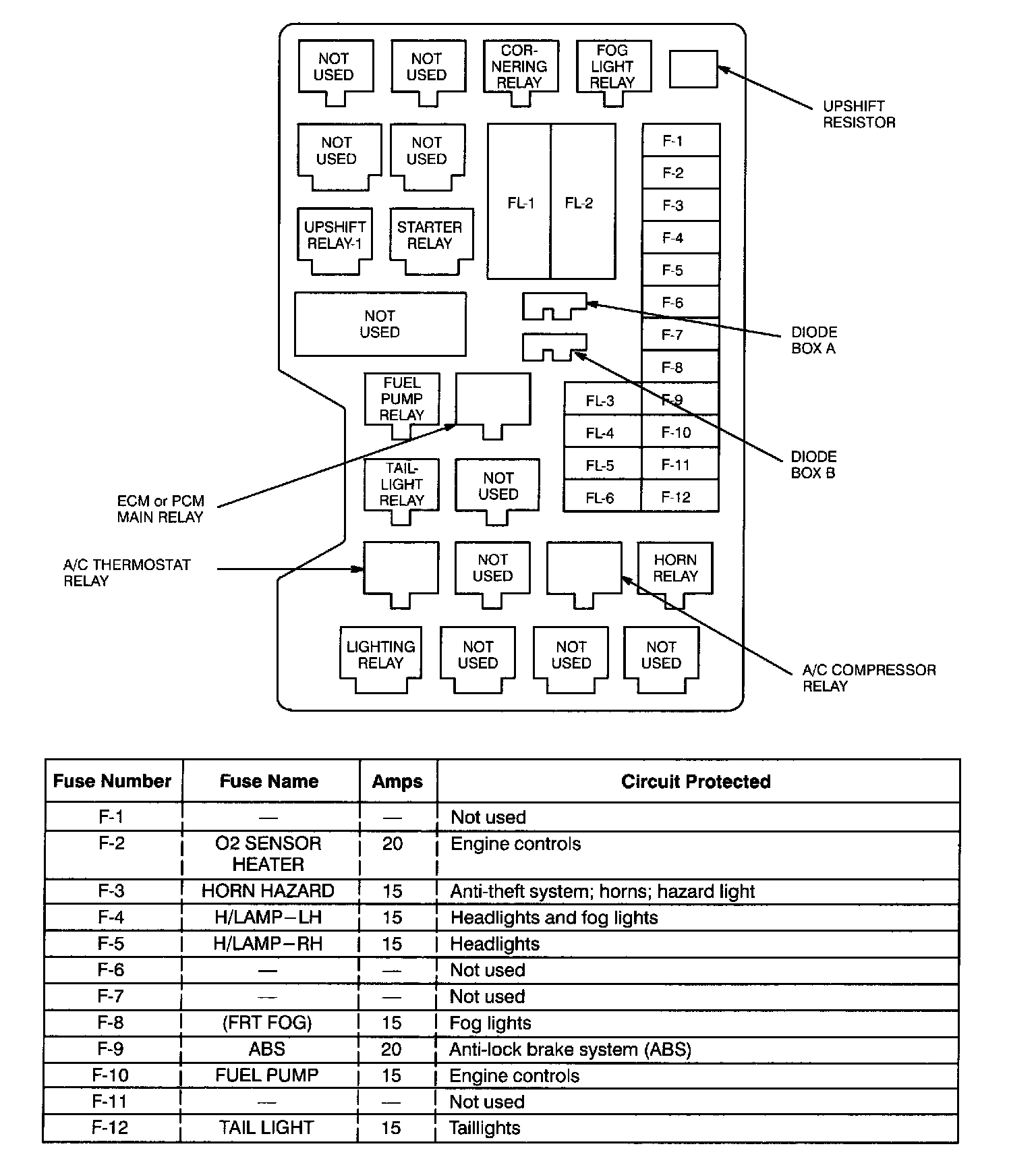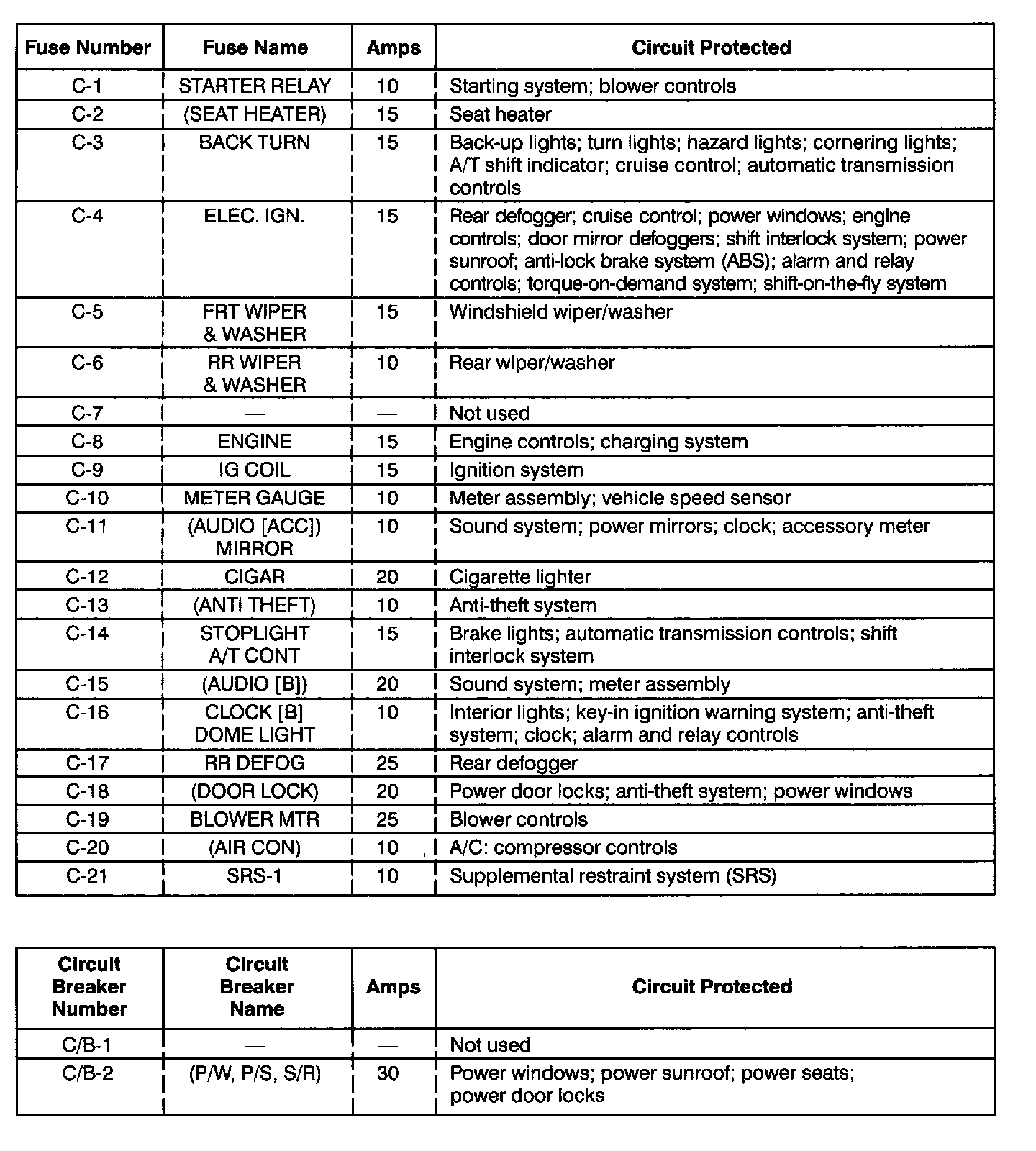 Dash and SRS Fuse Boxes Fuse Chart: