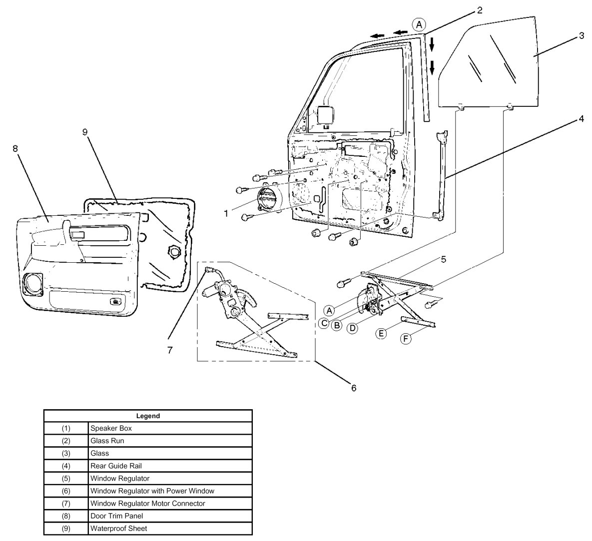4. Check to see of the window regulator operates smoothly and the glass opens and closes properly. Install the waterproof sheet with no clearance between the door panel and the waterproof sheet.