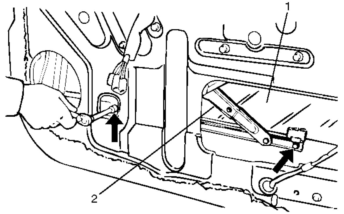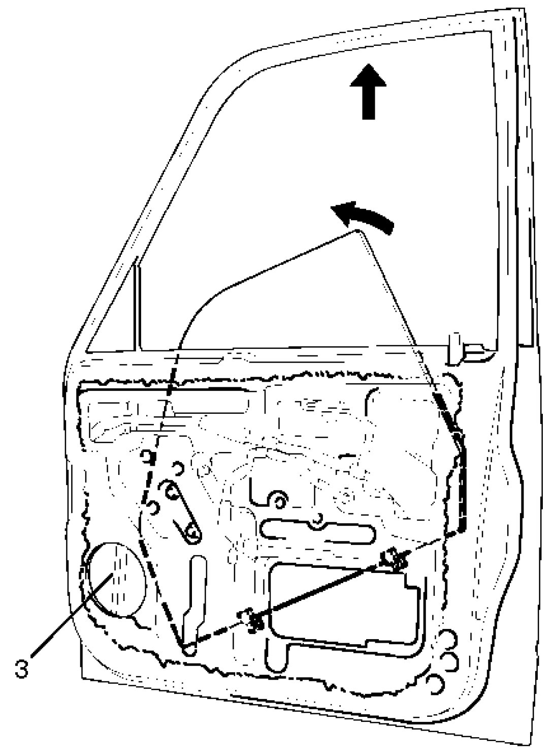 - Remove the glass fixing bolts from the window regulator (2) and lower the front side of the glass.