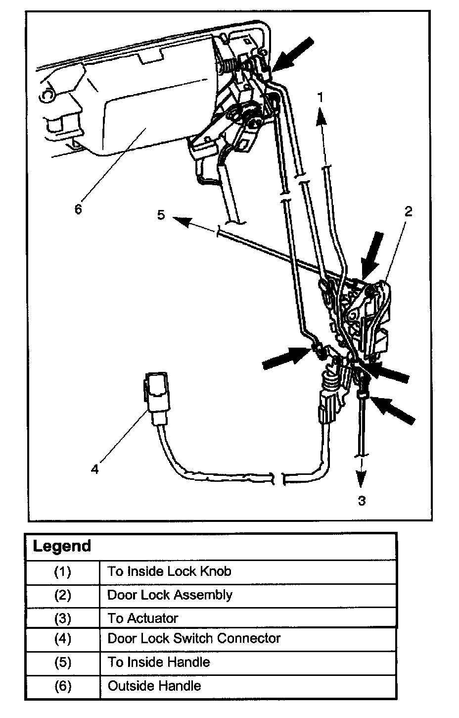 5. Disconnect the door lock switch connector (w/power door lock) and locking links (arrow marks positions), then remove the door lock assembly fixing screws and door lock assembly.