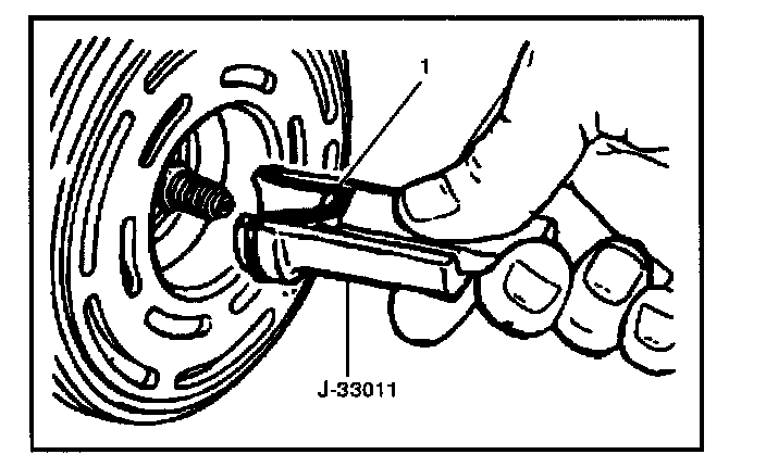 6. Fully engage the knurled tangs of Seal Remover-Installer J-23128-A into the recessed portion of the Seal (1) by turning the handle clockwise. Remove the Seal from the compressor with a rotary-pulling motion. Discard the seal. The handle must be hand-tightened securely. Do not use a wrench or pliers.