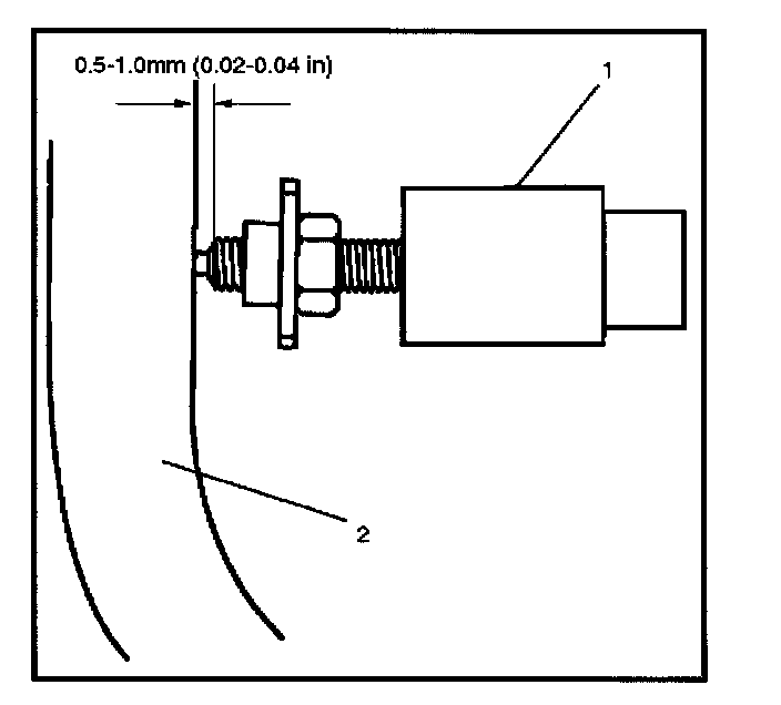 2. Turn the stoplight switch (1) clockwise until the tip of the threaded portion of the switch contacts the pedal arm (2).
