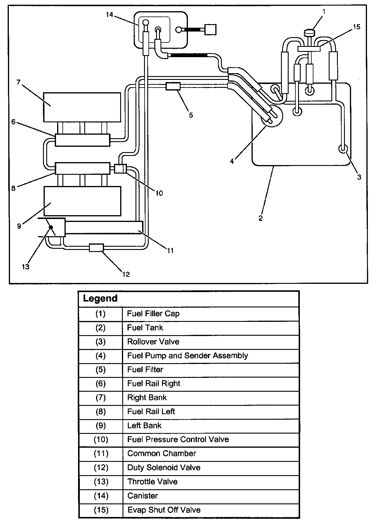 The in-tank fuel pump is an electric pump within an integral reservoir. The in-tank fuel pump supplies fuel through an in-line fuel filter to the fuel rail assembly. The fuel pump is designed to provide fuel at a pressure above the pressure needed by the fuel injectors. A fuel pressure regulator, attached to the fuel rail, keeps the fuel available to the fuel injectors at a regulated pressure. Unused fuel is returned to the fuel tank by a separate fuel return line.