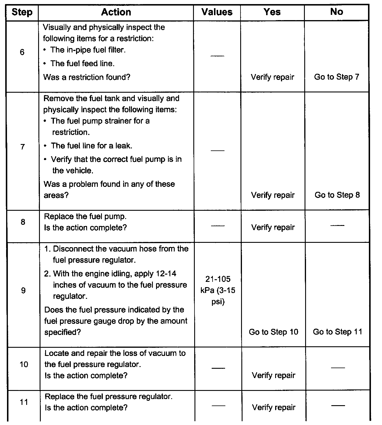 21. A lean condition may result from fuel pressure below 333 kPa (48 psi). A lean condition may cause a DTC P0131 or a DTC P0171 to set. Driveability conditions associated with lean conditions can include hard starting (when the engine is cold ), hesitation, poor driveability, lack of power, surging, and misfiring.