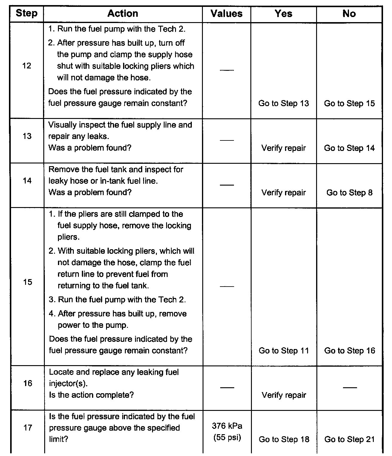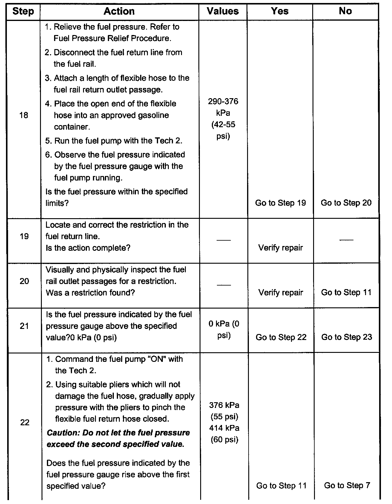 22. Restricting the fuel return line causes the fuel pressure to rise above the regulated fuel pressure. Command the fuel pump "ON" with the Tech 2. The fuel pressure should rise above 376 kPa (55 psi) as the fuel return line becomes partially closed.