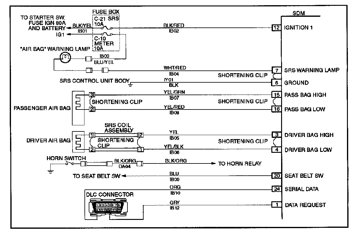The SRS consists of the Sensing and Diagnostic Module (SDM), the driver air bag assembly, the SRS coil assembly, the passenger air bag assembly and the "AIR BAG" warning lamp in the instrument cluster. The SDM, SRS coil assembly (driver side only), driver air bag assembly, passenger air bag assembly and connector wire make up the deployment loops. The function of the deployment loops is to supply current through air bag assembly, which will cause deployment of the air bags in the event of a frontal crash of sufficient force, up to 30 degrees off the centerline of the vehicle. The air bag assemblies are only supplied enough current to deploy when the SDM detects vehicle velocity changes severe enough to warrant deployment.