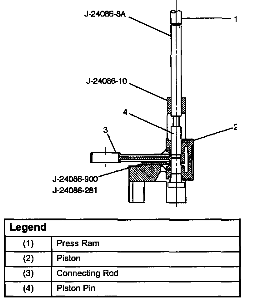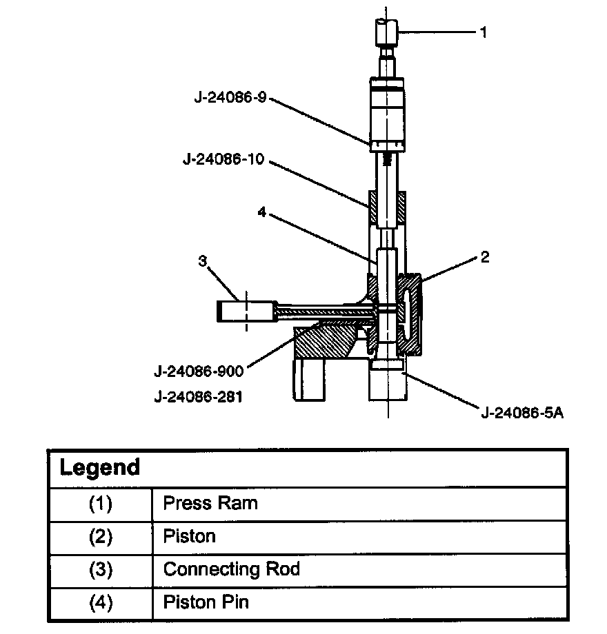 10. Remove the piston pin (9) using J-24086-C piston pin service set and piston support with a press.