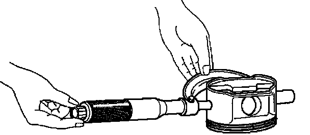 3. Insert the new pin into the piston and rotate it. If the pin rotates smoothly with no backlash, the clearance is normal. If there is backlash or roughness, measure the clearance. If the clearance exceeds the specified limit, the piston must be replaced.