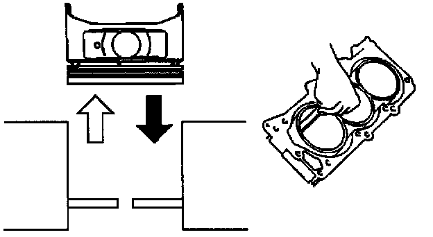 ^ Push the ring by the piston, at a right angle to the wall, into the point at which the cylinder bore diameter is the smallest.
