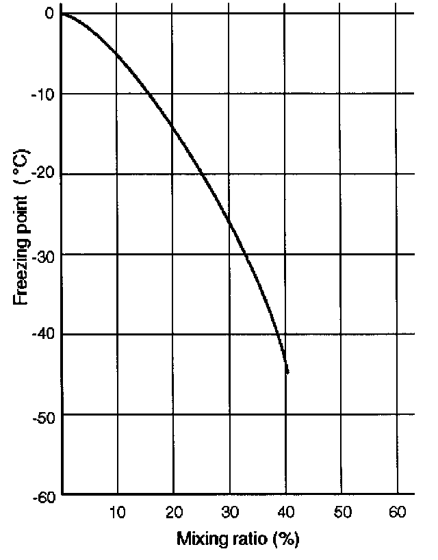 Antifreeze Solution^ Relation between the mixing ratio and freezing temperature of the Engine Coolant varies with the ratio of anti-freeze solution in water. Proper mixing ratio can be determined by referring to the chart. Supplemental inhibitors or additives claiming to increase cooling capability that have not been specifically approved by Isuzu are not recommended for addition to the cooling system.