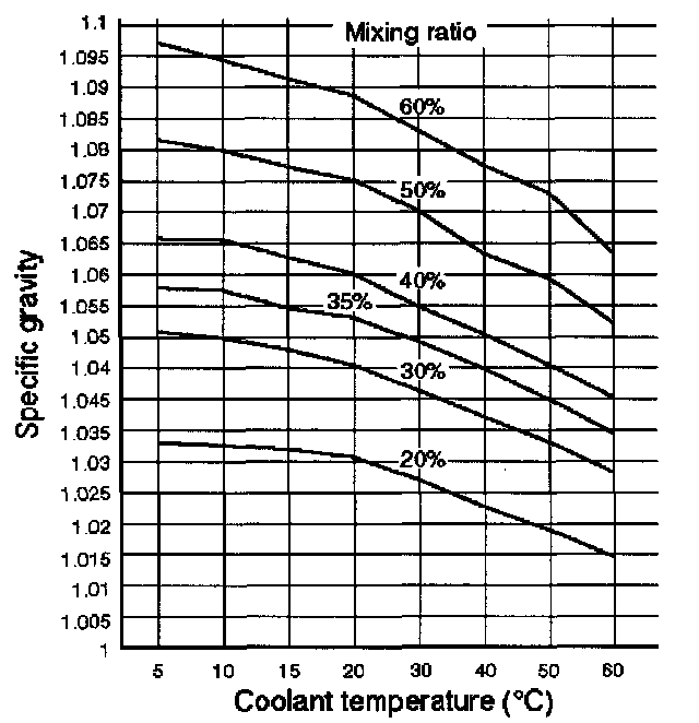 ^ Check the specific gravity of engine coolant in the cooling system temperature ranges from 0°C to 50°C using a suction type hydrometer, then determine the density of the engine coolant by referring to the table.