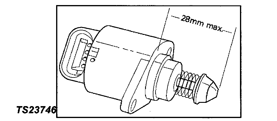 Measurement ProcedureIn order to install a new IAC valve, measure the distance between the tip of the pintle and the mounting flange. If that measurement is 28 mm or less, the valve need no adjustment. If the measurement is greater than 28 mm, apply finger pressure and retract the valve. The force required to retract the pintle on a new valve will not damage the valve, shaft or pintle.
