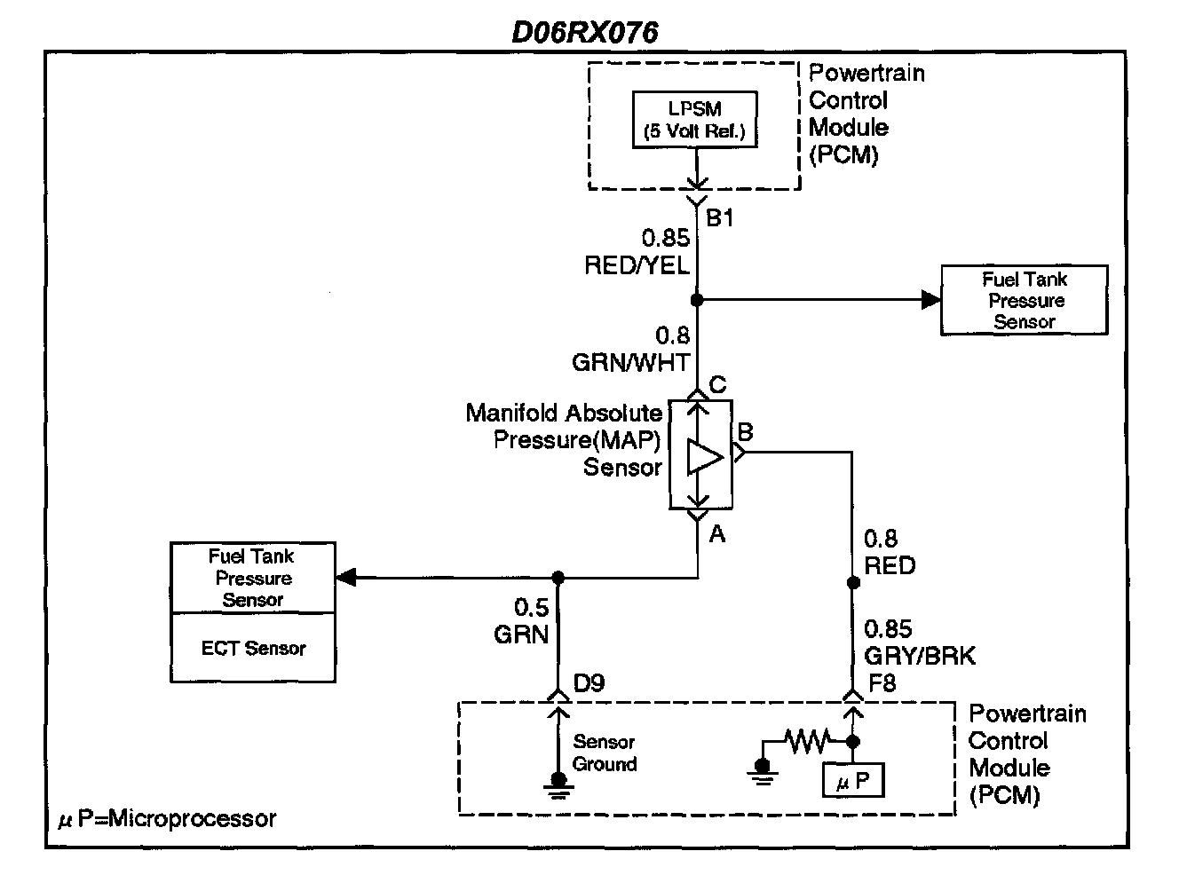 The manifold absolute pressure (MAP) sensor measures the changes in the intake MAP which result from engine load (intake manifold vacuum) and engine speed changes; and converts these into a voltage output. The powertrain control module (PCM) sends a 5-volt reference voltage to the MAP sensor. As the MAP changes, the output voltage of the sensor also changes. By monitoring the the sensor output voltage, the PCM knows the MAP. A lower pressure (low voltage) output voltage will be about 1-2 volts at idle. Higher pressure (high voltage) output voltage will be about 44.8 volts at wide open throttle. The MAP sensor is also used, under certain conditions, to measure barometric pressure, allowing the PCM to make adjustments for different altitudes. The PCM uses the MAP sensor to diagnose proper operation of the EGR system, in addition to other functions.