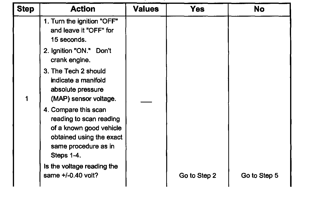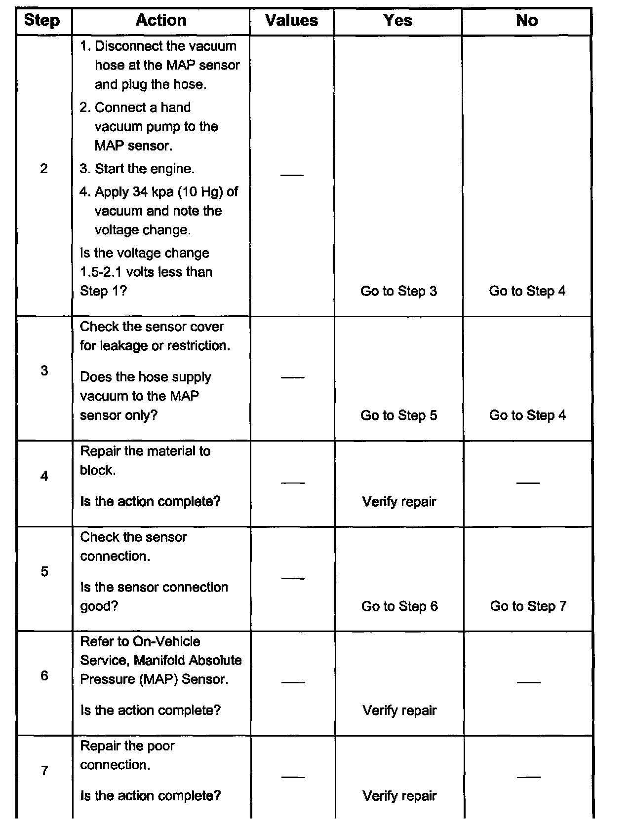 2. Applying 34 kpa (10 Hg) vacuum to the MAP sensor should cause the voltage to be 1.5 - 2.1 volts less than the voltage at step 1. Upon applying vacuum to the sensor, the change in voltage should be instantaneous. A slow voltage change indicates a faulty sensor.