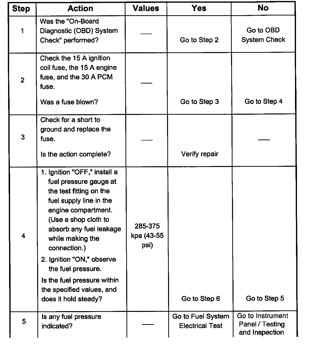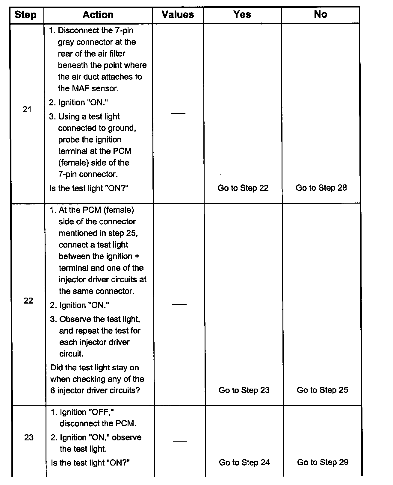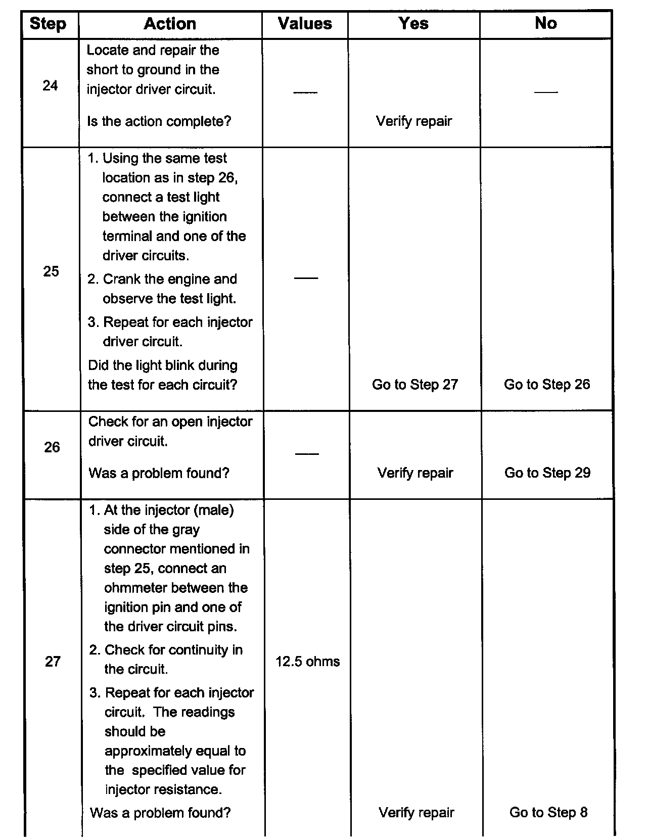 This procedure only tests the driver circuit as far as the test connection, so step 31 is added to test the circuit all the way to the injector.