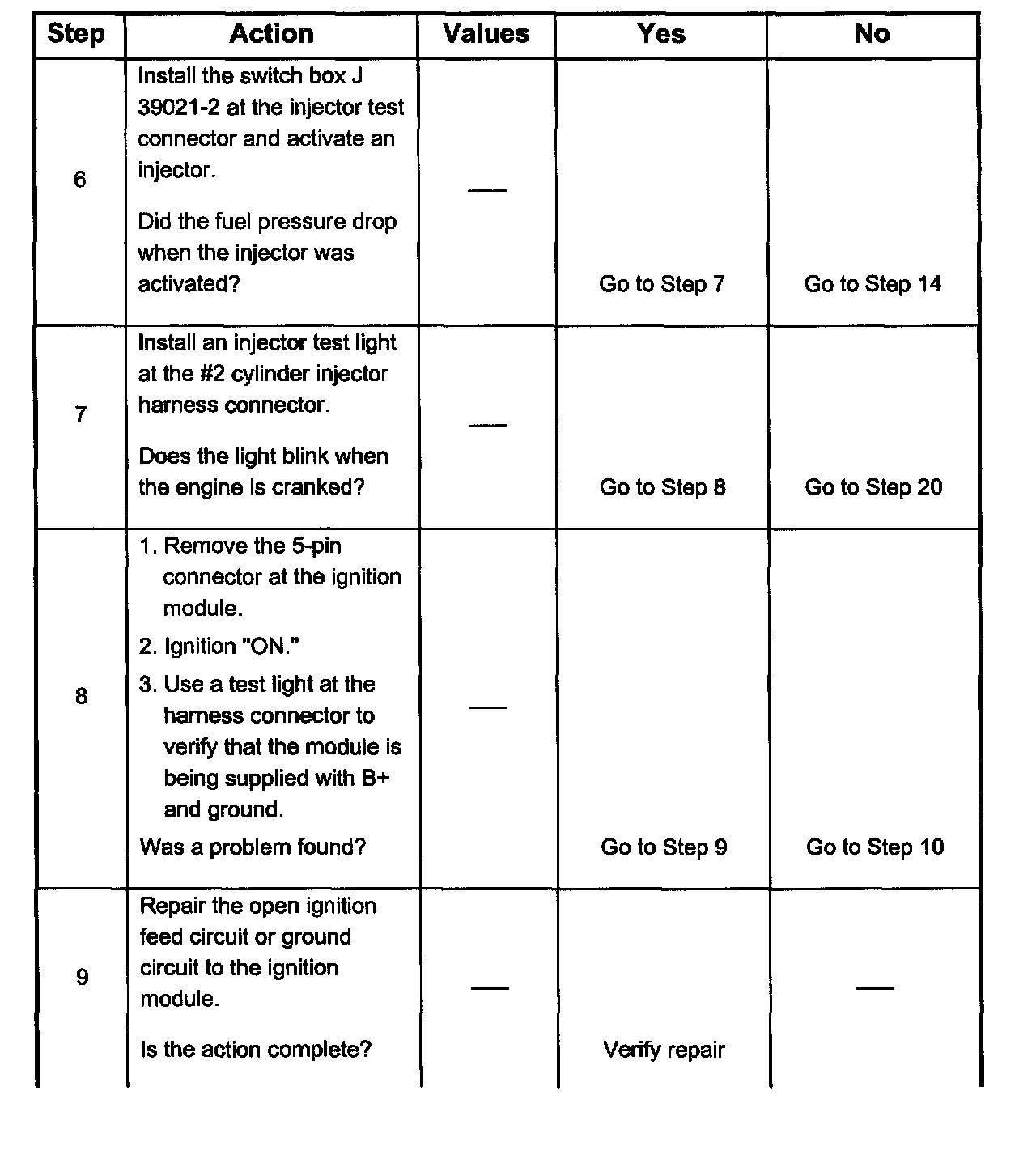 25. If there is an open or shorted driver circuit, DTCs 201 to 206 and a misfire DTCs 301 to 306 should be set. All six injector driver circuits can be checked at one time without removing the intake manifold if a J 39021-95 test light is available. This is the alternative procedure: