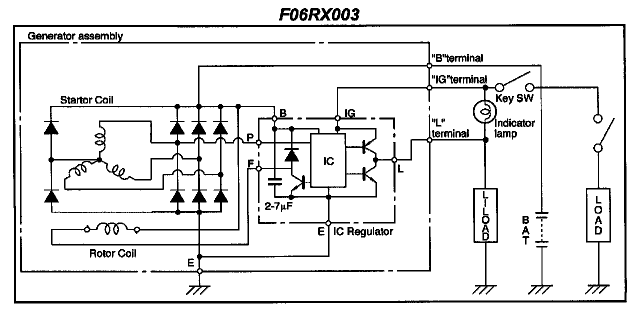 Disconnect wiring connector from generator, and ground the terminal "L" on connector side.