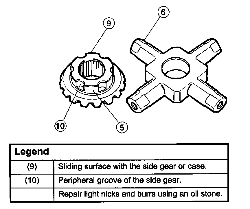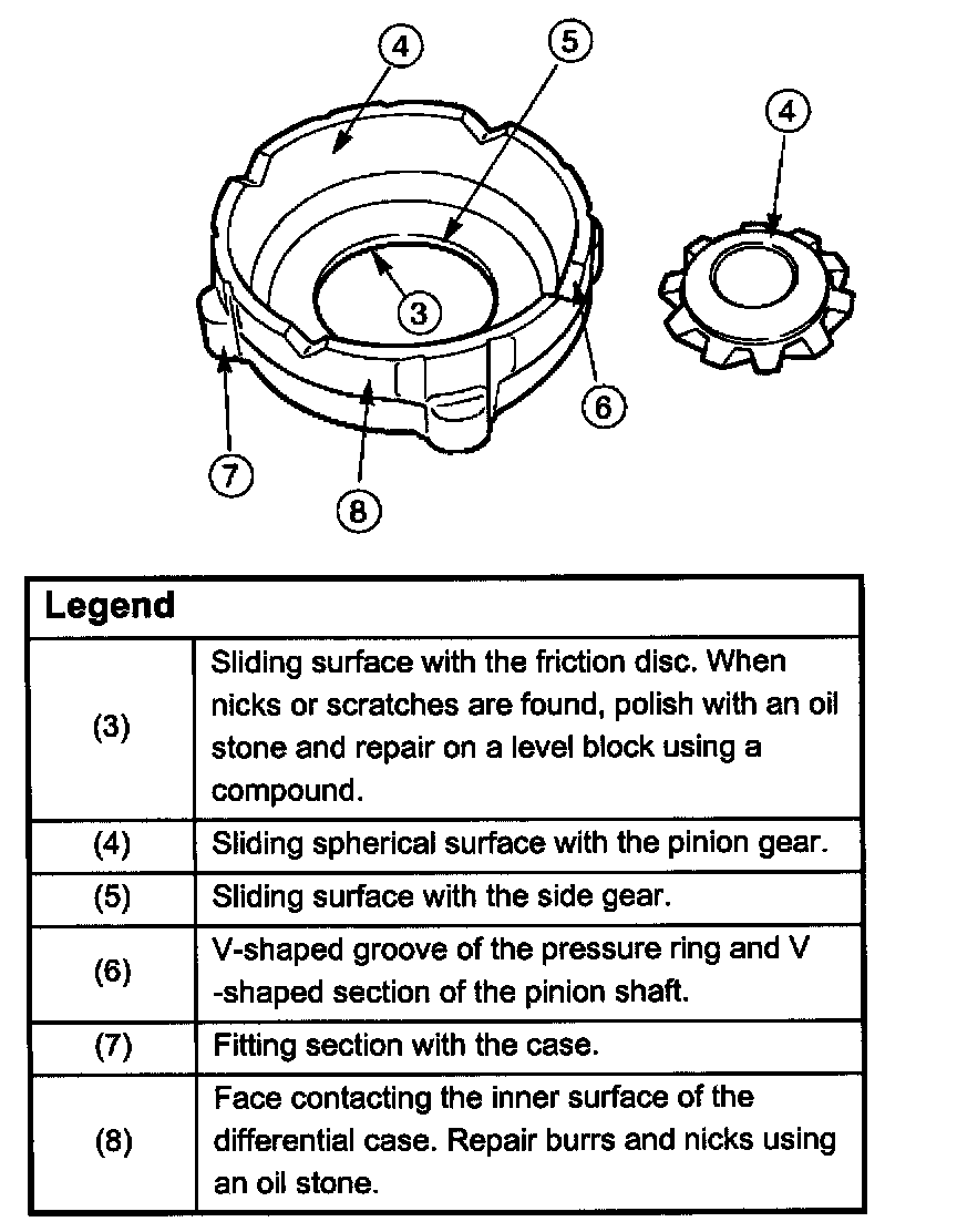 ^ Assemble the side gear, pinion, pinion shaft, pressure ring and thrust washer, and pressing the pressure ring to-the pinion shaft in the direction of the shaft to make the clearance 0.