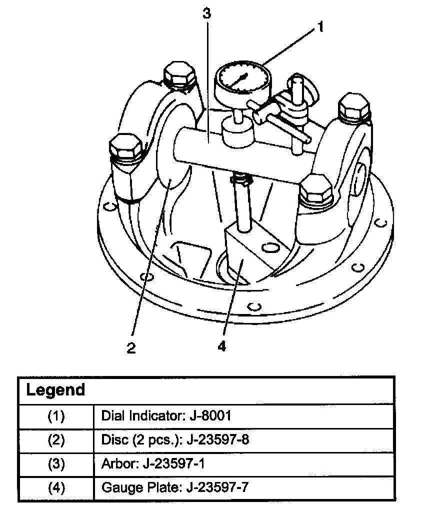 8. Clean the side bearing bores. Install the dial indicator with the discs and arbor. Install and tighten the bearing caps to the specified torque.
