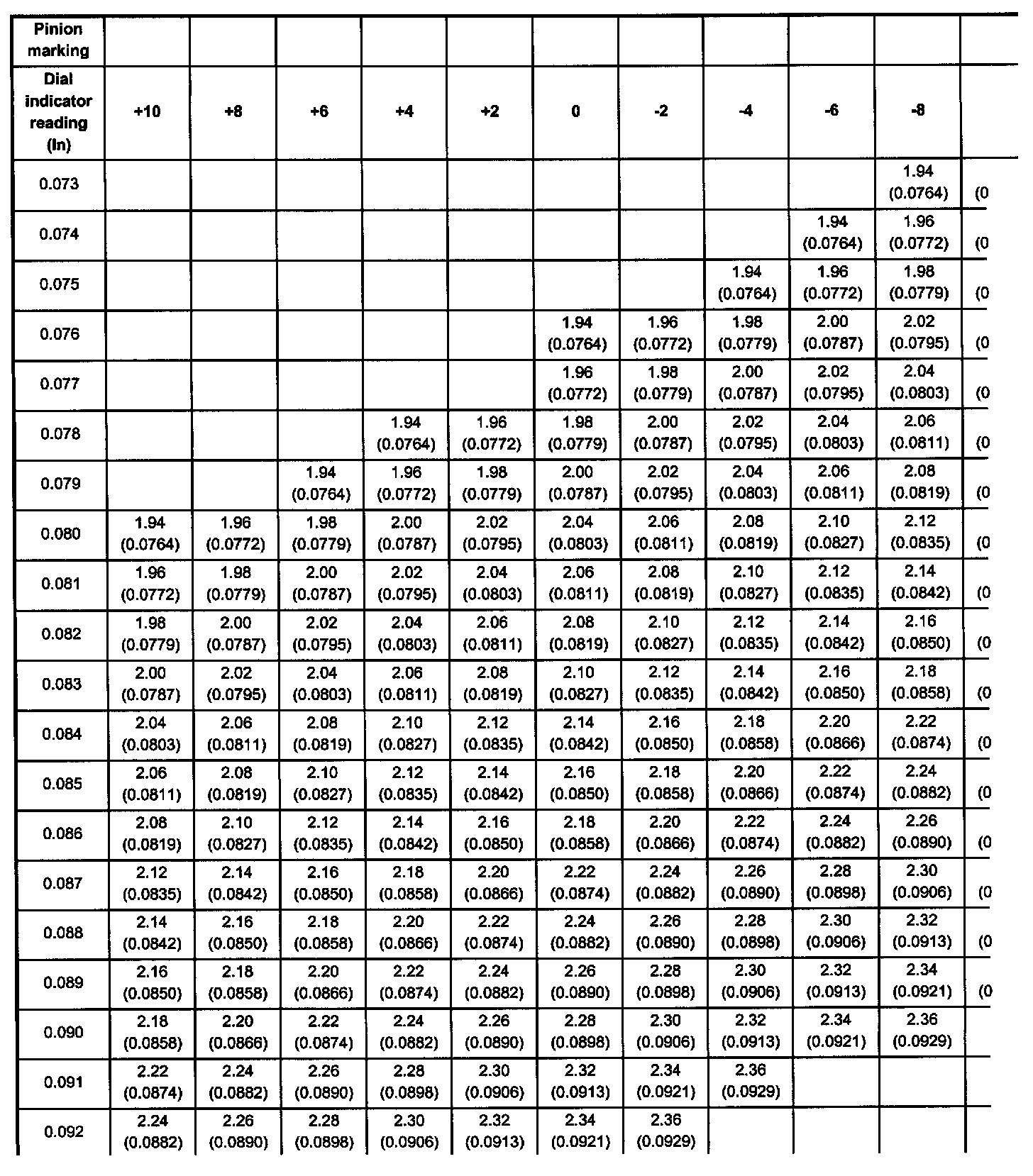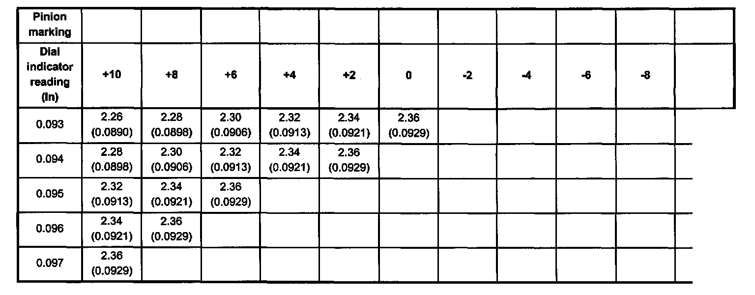 The number indicates a necessary change in the pinion mounting distance. A plus number indicates the need for a greater mounting distance (which can be achieved by decreasing the shim thickness). A minus number indicates the need for a smaller mounting distance (which can be achieved by increasing the shim thickness). If examination reveals pinion depth code "O", the pinion is "nominal".