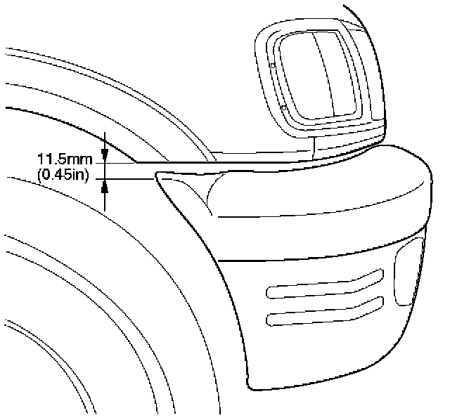 - When the bolts fixing front bumper assembly are tightened, adjustment should be made between the back bar and front side bumper so that a clearance of 14.5 mm (0.57 in) is provided between the lower side of the fender and the upper side of the front bumper.