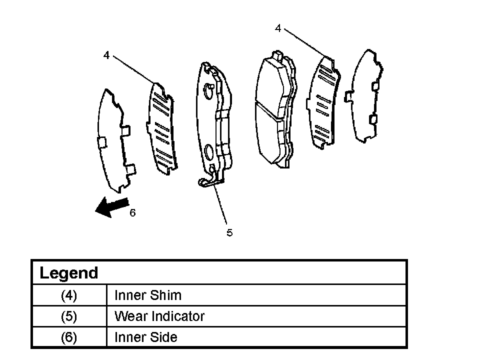 2. Apply special grease (approximately 0.2 g) to both contacting surfaces of the inner shims (4). Wipe off extruded grease after installing. Install pad assembly with shim.