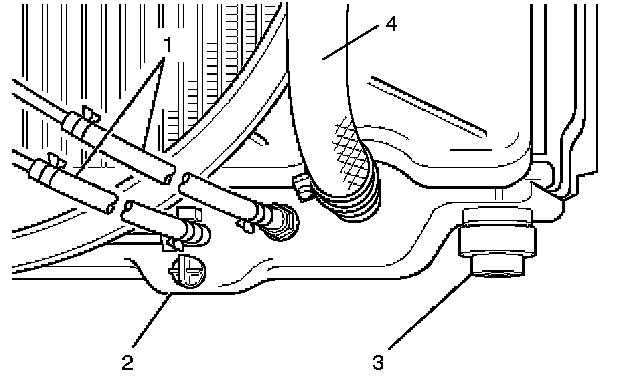 1. Completely drain the cooling system by opening the drain plug (2) at the bottom of the radiator.